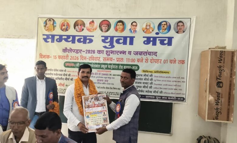 सम्यक युवा मंच फाउंडेशन द्वारा प्रतिपादित कैलेंडर-2026 का शुभारंभ व जनसंवाद का कार्यक्रम जी.एन.इंटरनेशनल स्कूल बरपुर,मऊ में संपन्न हुआ।कार्यक्रम का शुभारंभ तथागत बुद्ध की प्रतिमा के समक्ष दीप प्रज्ज्वलन व संविधान की प्रस्तावना का सामूहिक वाचन कर किया गया। संवादशाला में उपस्थित अतिथियों का पंचशील से जिला संयोजक रामकेश मौर्य ने स्वागत किये। सम्यक युवा मंच के संस्थापक व संयोजक अखिलेश मौर्य ने मुख्य अतिथि एडवोकेट महेंद्र प्रताप मौर्य (अधिवक्ता-दीवानी कचहरी मऊ) को प्रथम कैलेंडर भेंट कर शुभारंभ किये ।साथ ही समस्त उपस्थित अतिथियों को कैलेंडर भेंट किया गया। अखिलेश मौर्य ने बताएं कि सम्यक युवा मंच फाउंडेशन समाज में शिक्षा, समानता व वैज्ञानिक चेतना के क्षेत्र में जागरूकता हेतु कार्य करता है। यह कैलेंडर हमारे कार्यों का एक संकलन है।विशिष्ट अतिथि डॉ संतोष मौर्य, संजय बाबर ने फाउंडेशन के कार्यों व प्रयासों की सराहना किये ।जसवंत मौर्य ने कहे कि बिना शिक्षा के समाज का विकास संभव नहीं है, हमारे युवाओं को सही दिशा में कदम बढ़ाने की आवश्यकता है। पुष्पा मौर्य, दिनेश प्रजापति, कैरियर कोचिंग सेंटर के डायरेक्टर संजय सर ने अपनी सारगर्भित विचार रखें। भाजपा जिला संयोजक सुभाष मौर्य ने फाउंडेशन को हर संभव मदद देने का आश्वासन दिए।मुख्य अतिथि एडवोकेट महेंद्र प्रताप मौर्य ने कहे कि युवा ही हमेशा नवसृजन किए हैं और इस कार्य में युवा आगे आएं,इसके लिए मेरा सहयोग निरंतर बना रहेगा।सीताराम मौर्य ने अपनी शुभकामनाएं दिए।कार्यक्रम की अध्यक्षता योगेंद्र यादव व संचालन राजेश कुशवाहा ने किये। उपस्थित समस्त अतिथियों व सम्भ्रांत जन के प्रति आभार जिला संयोजक रामकेश मौर्य ने ज्ञापित किये ।इस अवसर पर रुचि मौर्य, नरेंद्र मौर्य, राजेंद्र पाल, विनोद कुशवाहा, रमेश यादव, अश्वनी पाल, हरेंद्र प्रसाद, अभिमन्यु कुशवाहा, ओमप्रकाश भारती, त्रिवेणी मौर्य, उमेश राव,लक्ष्मण प्रसाद मौर्य आदि लोग उपस्थित रहे।