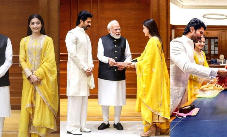 नई दिल्ली। साउथ सिनेमा की दुनिया में विजय देवरकोंडा और रश्मिका मंदाना शादी को लेकर चर्चाओं में हैं। इस कपल ने 26 फरवरी को उदयपुर में तेलुगु और कोडवा रीति-रिवाजों के साथ शादी की। अब 4 मार्च को हैदराबाद में ग्रैंड रिसेप्शन रखा गया है, जिसका न्योता कपल ने खुद प्रधानमंत्री नरेंद्र मोदी से मुलाकात कर उन्हें दिया। विजय देवरकोंडा और रश्मिका मंदाना ने दिल्ली में प्रधानमंत्री मोदी से मुलाकात की। इस मुलाकात की तस्वीरें सोशल मीडिया पर तेजी से वायरल हो रही हैं। तस्वीरों में विजय और रश्मिका पारंपरिक परिधानों में नजर आ रहे हैं। तस्वीरों में वे प्रधानमंत्री को शॉल भेंट करते दिखाई दे रहे हैं। दोनों के चेहरे पर खुशी की झलक साफ नजर आ रही है। कपल ने पीएम मोदी को 4 मार्च को हैदराबाद में होने वाले उनके वेडिंग रिसेप्शन के लिए निमंत्रण कार्ड भी दिया।