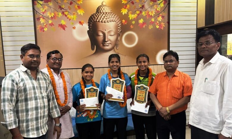 बस्ती: खो-खो की नेशनल विजेताओं का सम्मान; डॉ. वी.के. वर्मा ने खुशी, अर्तिका और भार्गवी को नकद राशि व शील्ड देकर बढ़ाया हौसला।